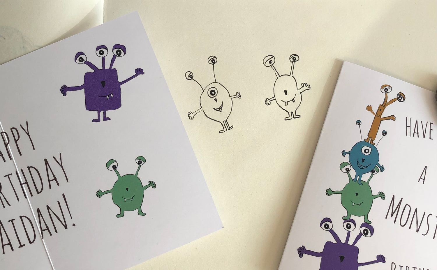 Sharon designs our cards. She begins thinking about a possible character or focal point of a card.