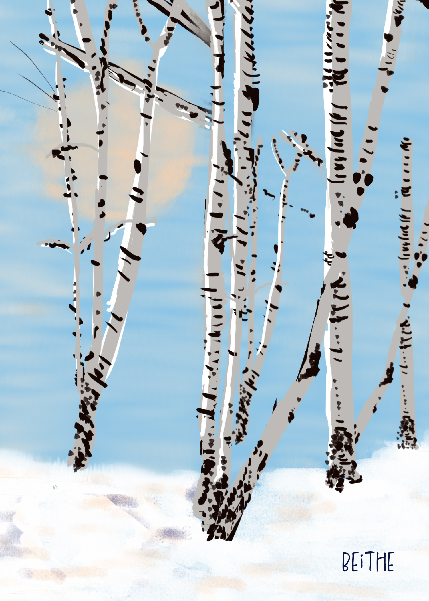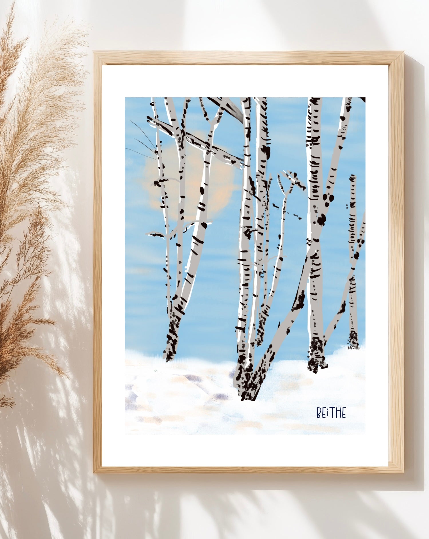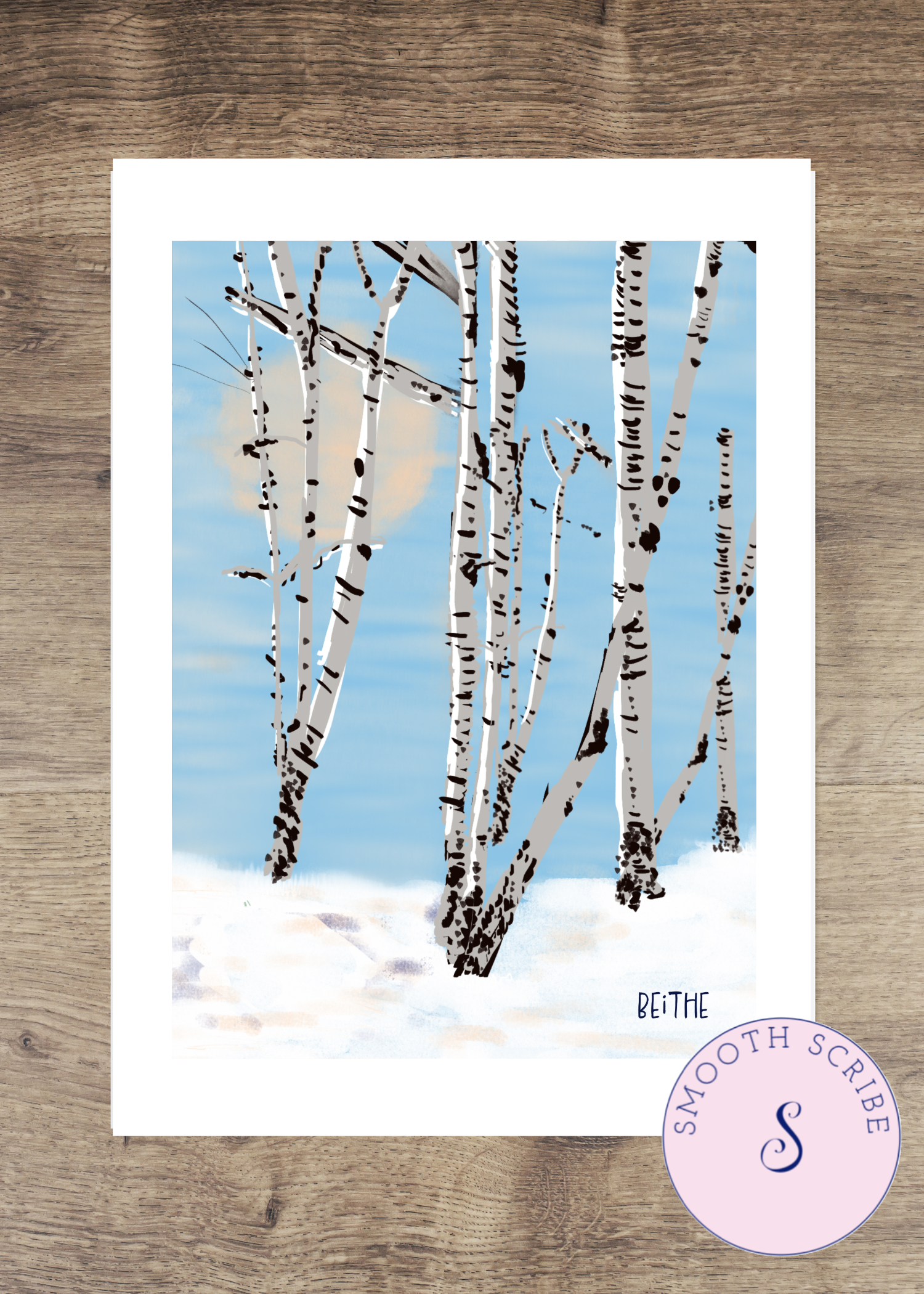 This A4 fine art hand drawn print called Beithe (silver birch in Gaelic) shows the beauty of its trunk against the wolf moon. This makes the perfect gift for any nature lover or simply to adorn a special place in your home.