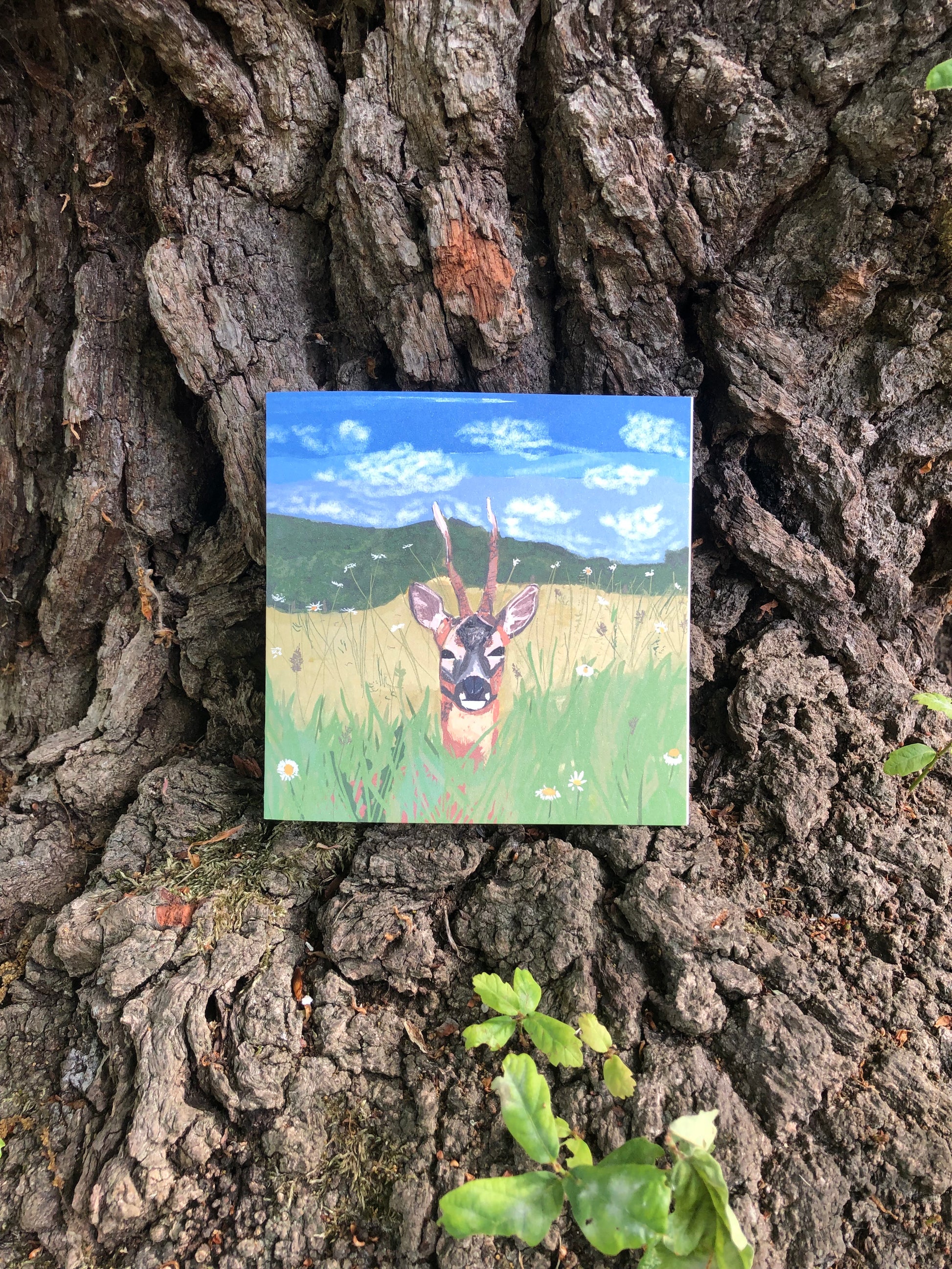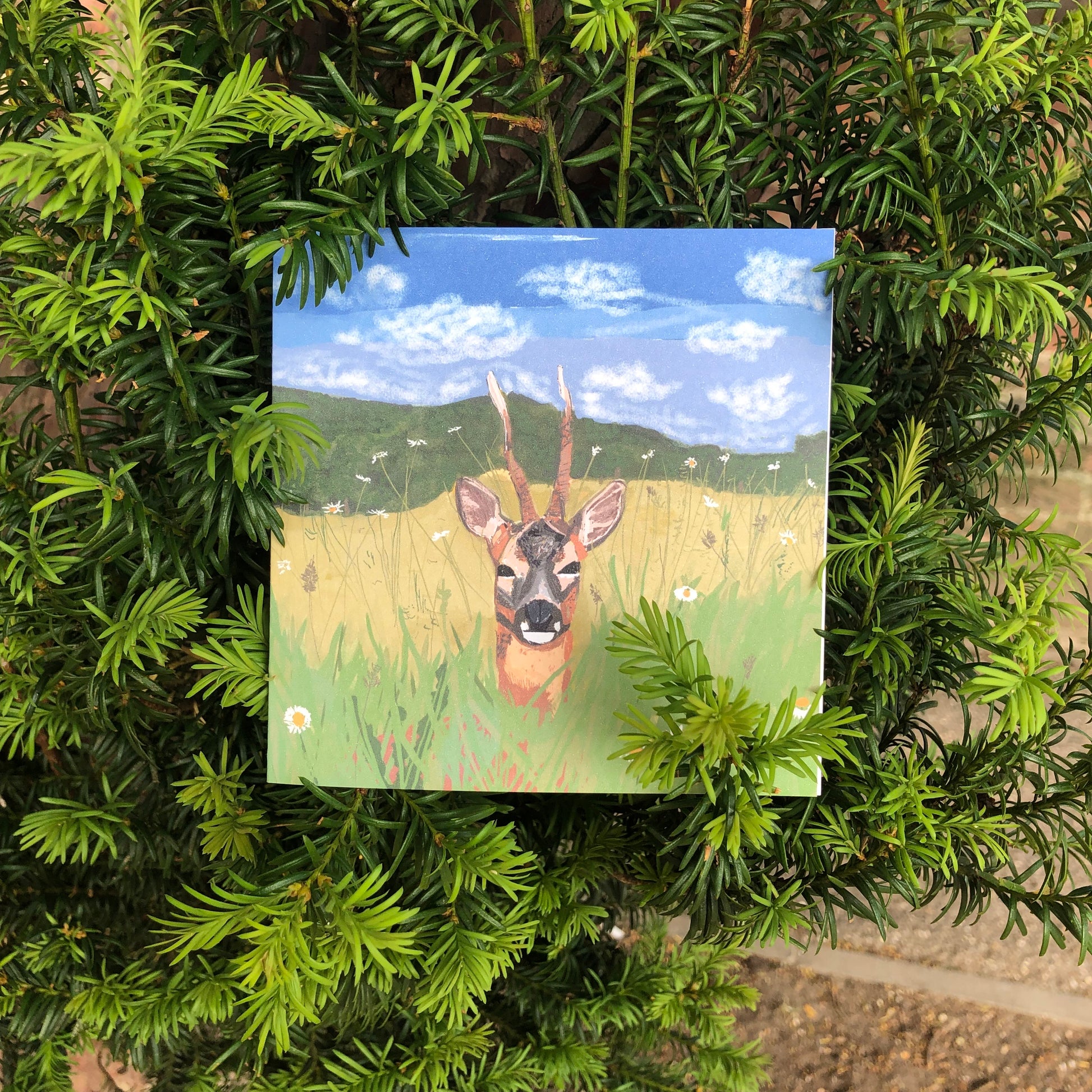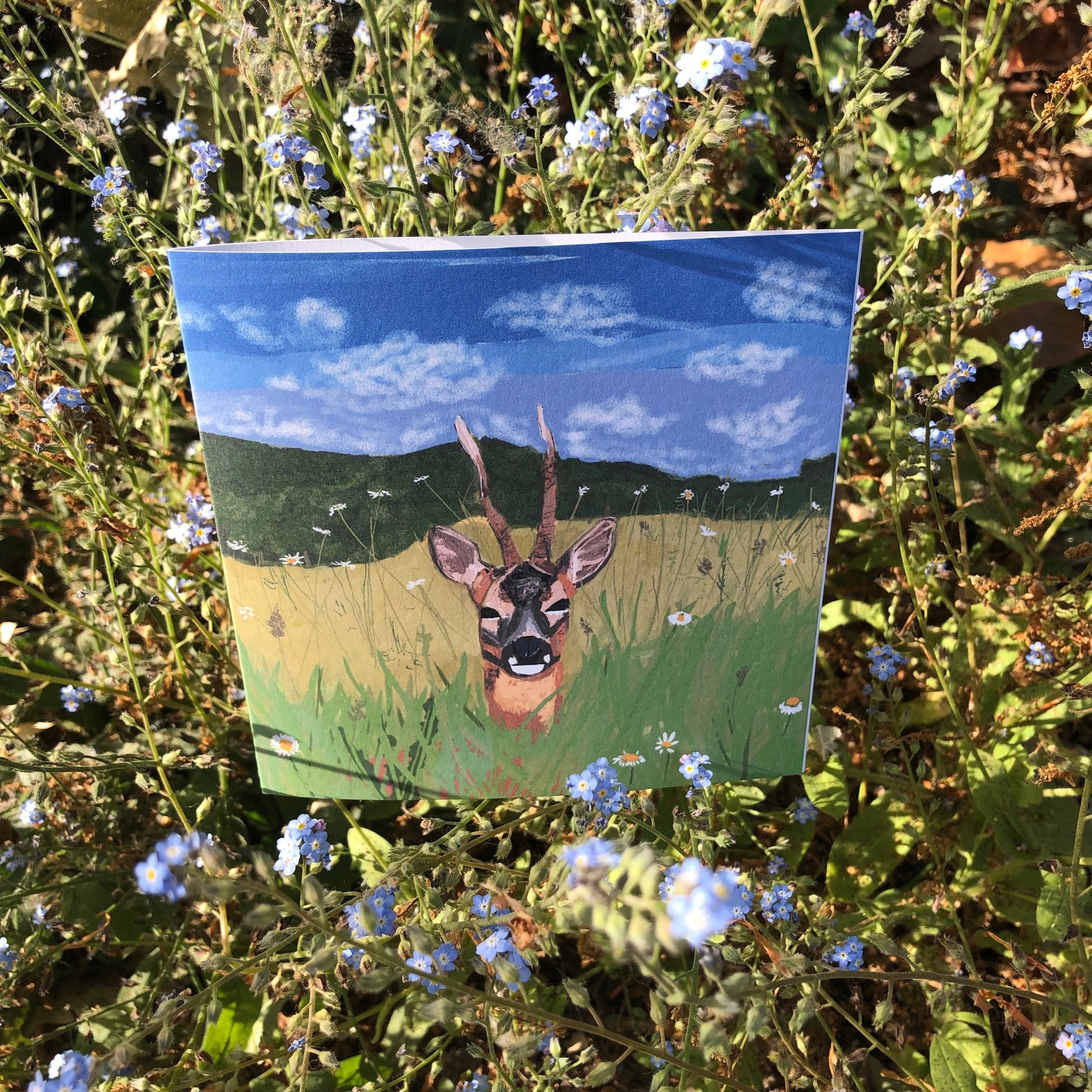 Celebrate the beauty of British roe deer with this delicately hand-illustrated greeting card featuring roe deer and native wildflowers. A joyful beautiful roe deer in long grass set against a wild meadow landscape; a card for any nature lover.