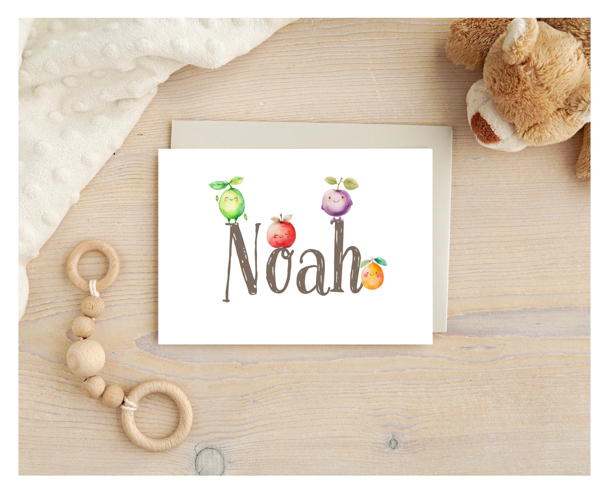 Gift our personalized child‘s birthday card to celebrate your son, daughter, niece, nephew, toddler, infant, granddaughter, grandson or infants birthday. This fun fruit card is tactile and organic. Each card will be unique as the length of the name might need more fruit or need to be positioned slightly differently based on the letters in the name.